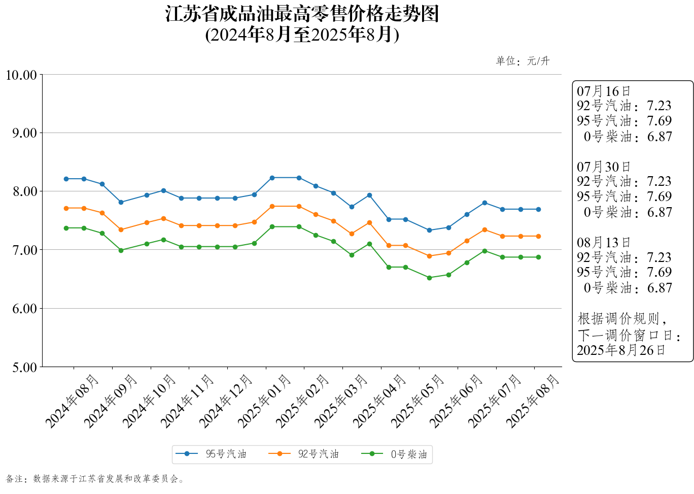 江苏省成品油最高零售价格走势图(2025年8月13日)