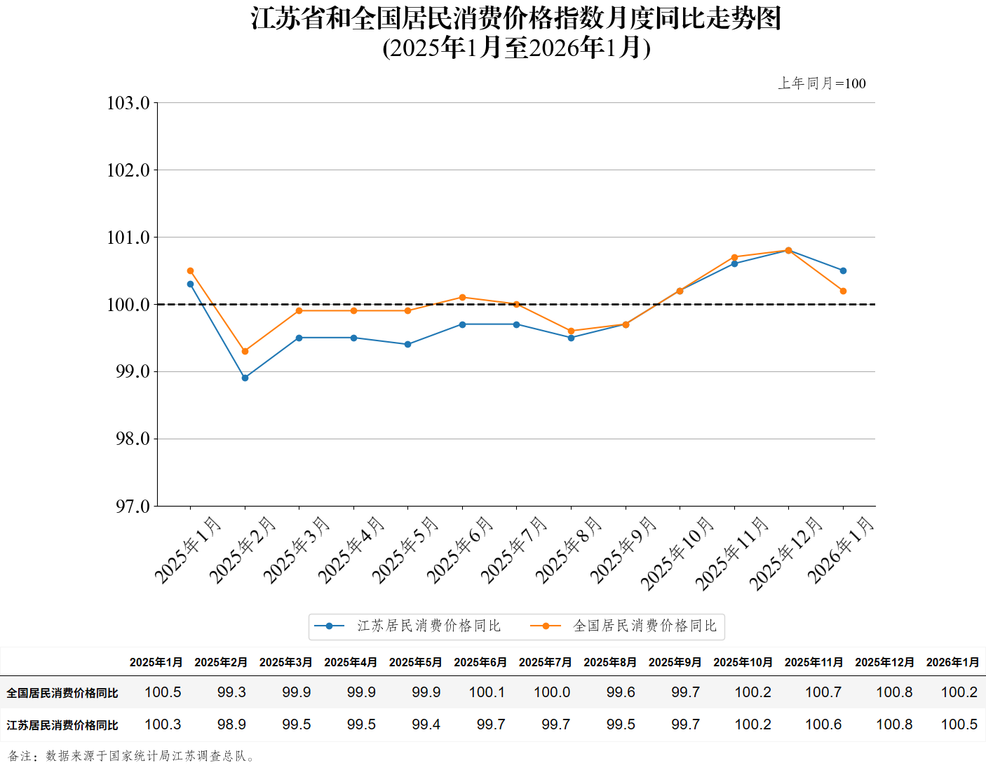 江苏省和全国居民消费价格指数月度同比走势图(2026年1月)