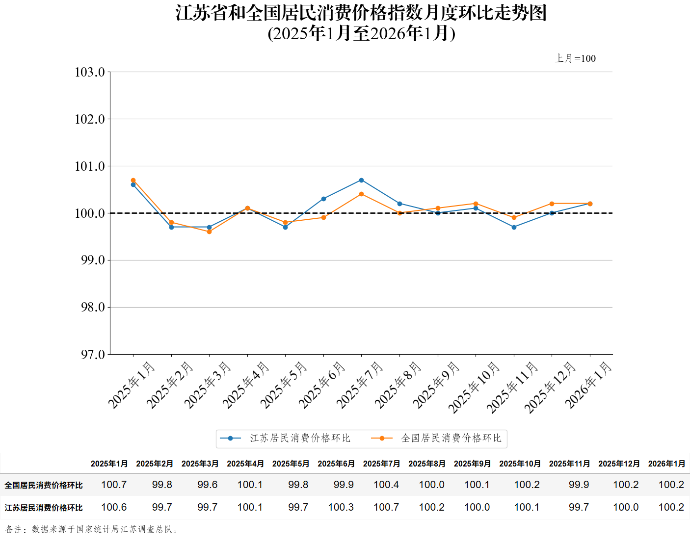 江苏省和全国居民消费价格指数月度环比走势图(2026年1月)