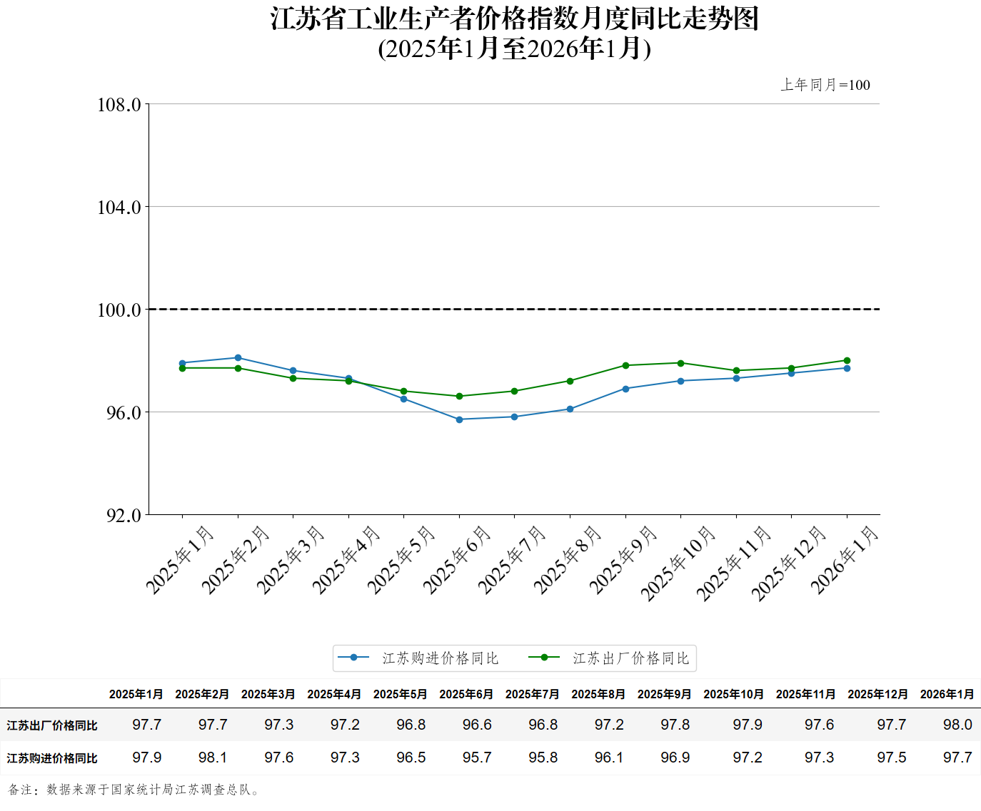 江苏省工业生产者价格指数月度同比走势图(2026年1月)