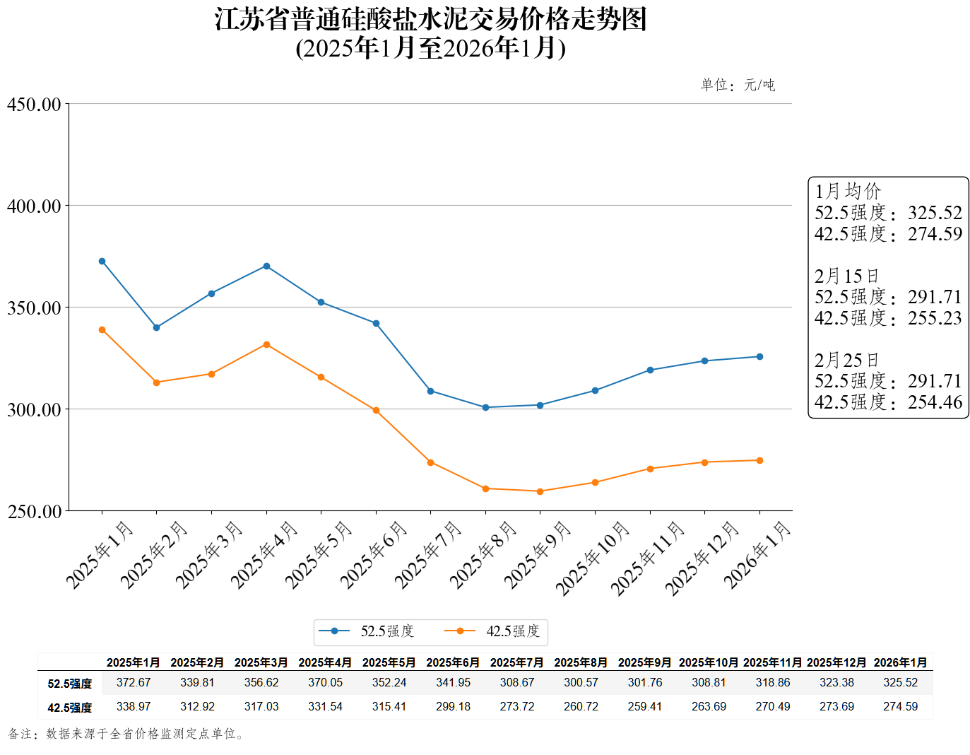 江苏省普通硅酸盐水泥交易价格走势图(2026年2月25日)