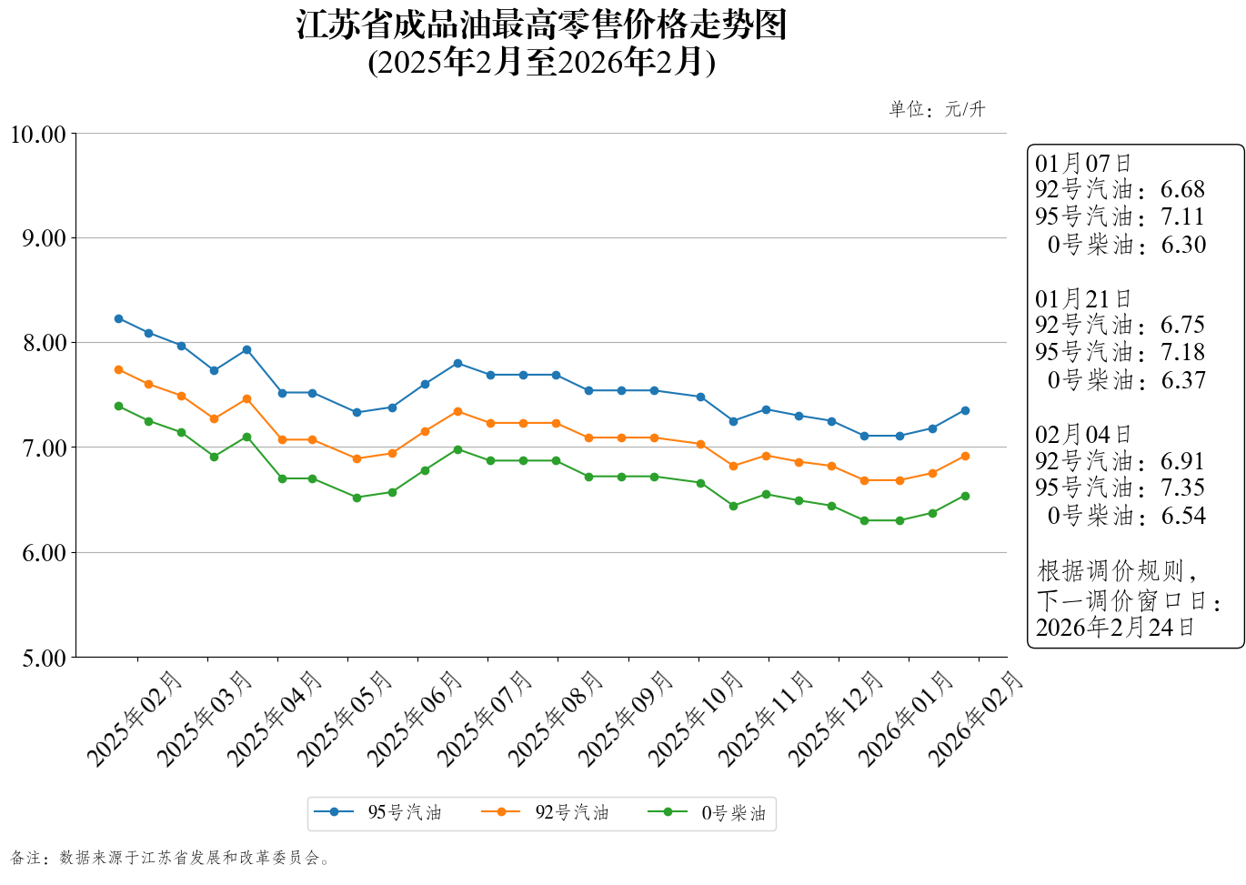江苏省成品油最高零售价格走势图(2026年2月4日)