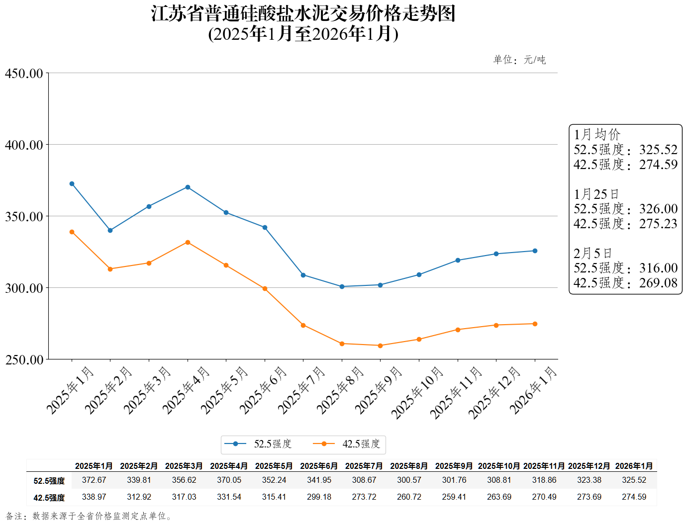 江苏省普通硅酸盐水泥交易价格走势图(2026年2月5日)