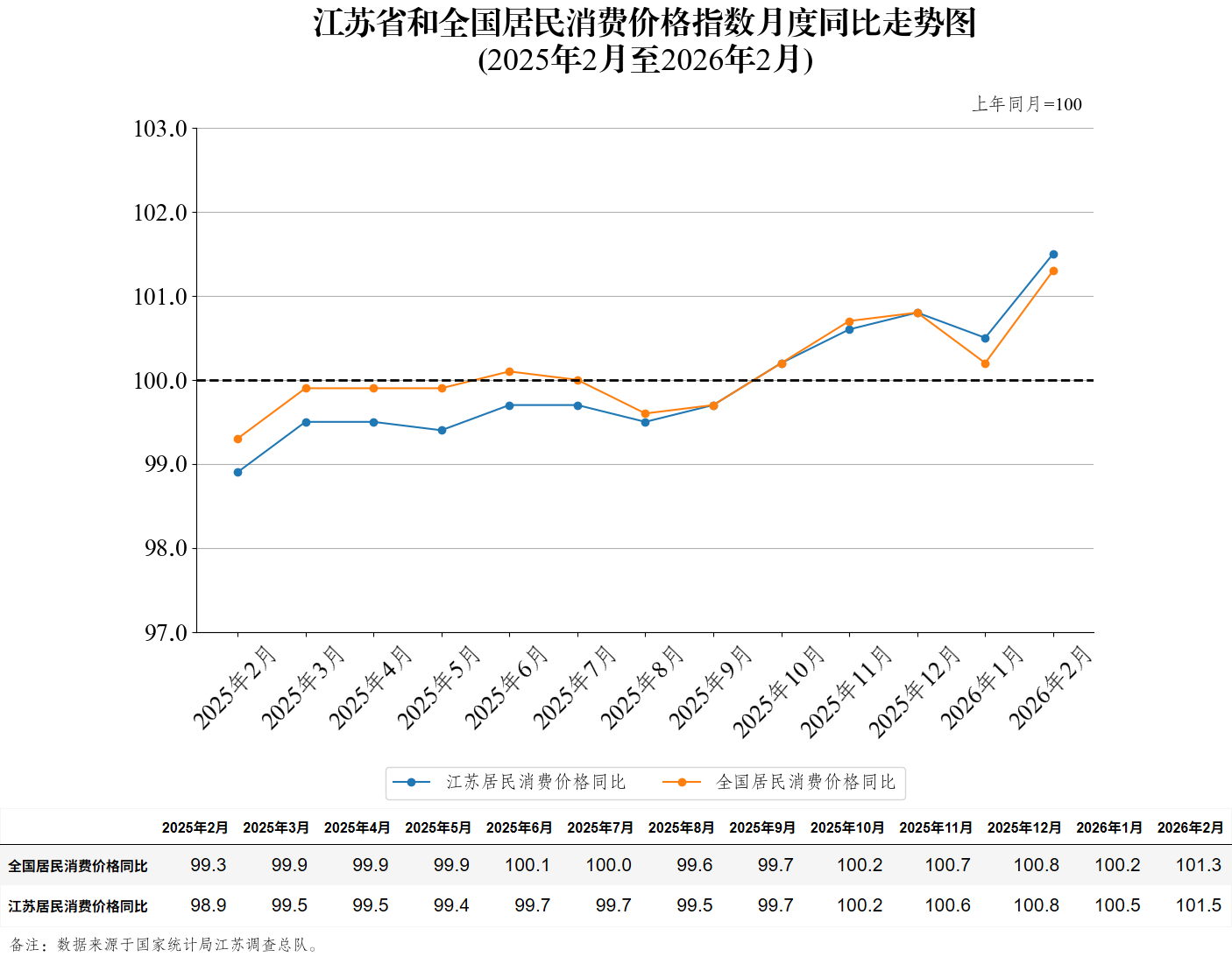 江苏省和全国居民消费价格指数月度同比走势图(2026年2月)