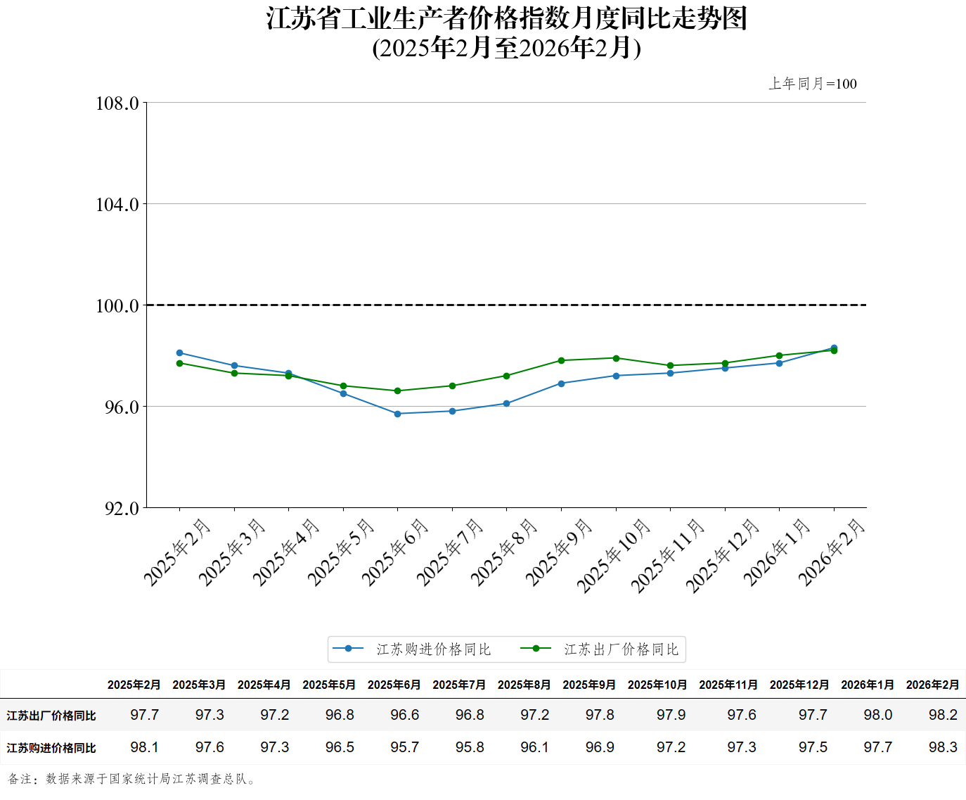 江苏省工业生产者价格指数月度同比走势图(2026年2月)