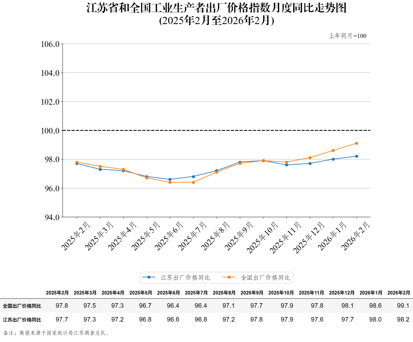 江苏省和全国工业生产者出厂价格指数月度同比走势图(2026年2月)