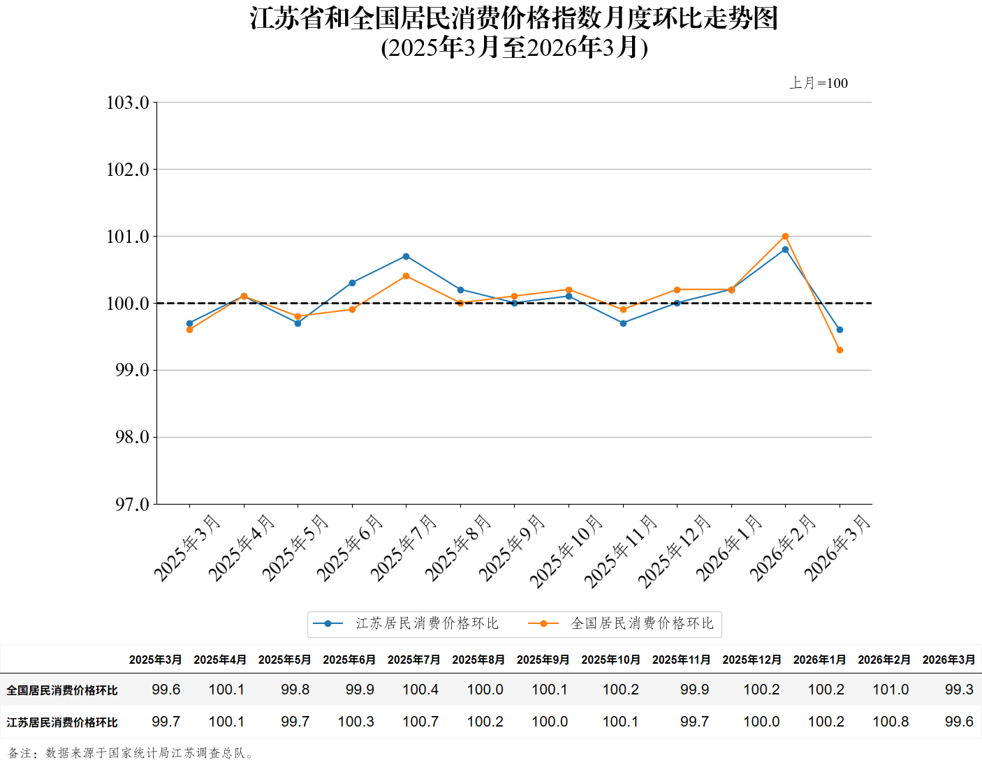 江苏省和全国居民消费价格指数月度环比走势图(2026年3月)