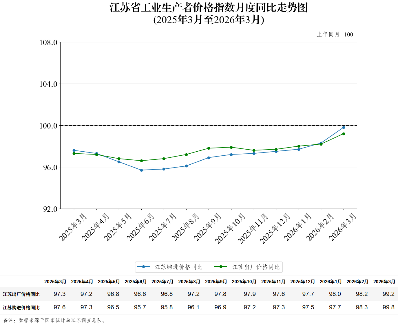 江苏省工业生产者价格指数月度同比走势图(2026年3月)