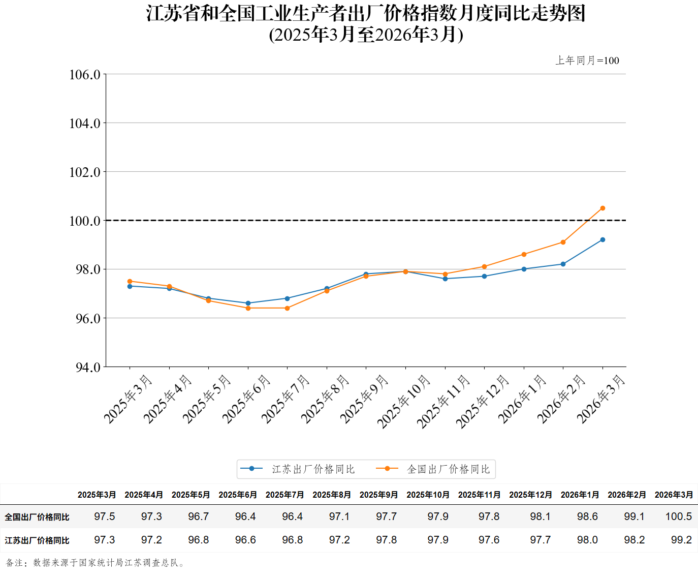 江苏省和全国工业生产者出厂价格指数月度同比走势图(2026年3月)