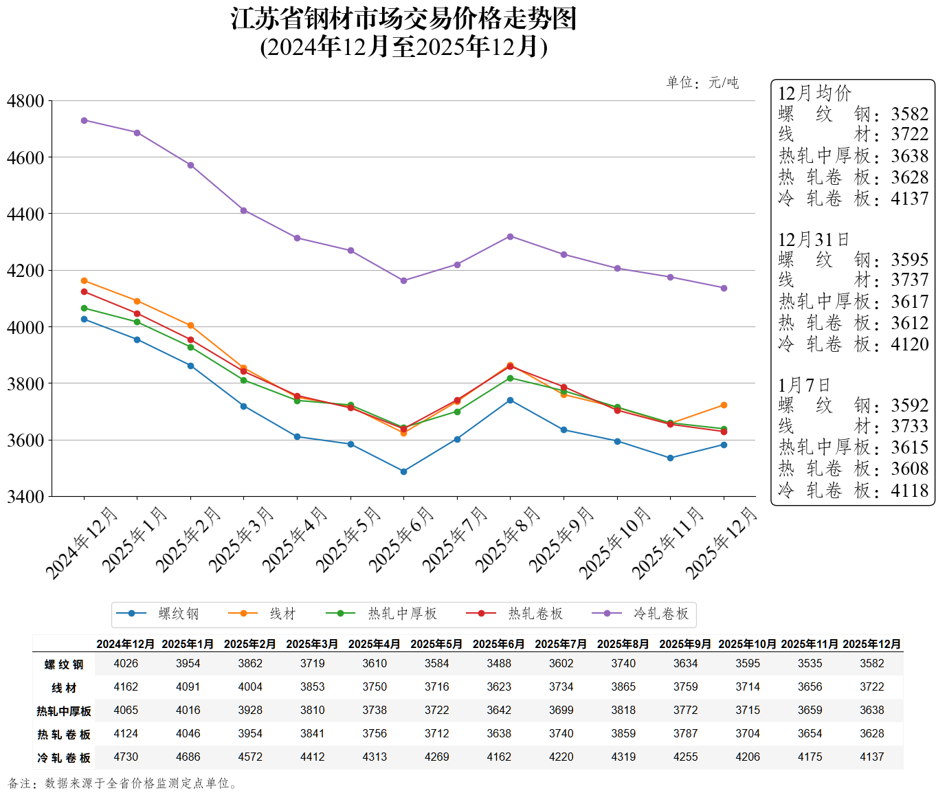江苏省钢材市场交易价格走势图(2026年1月7日)