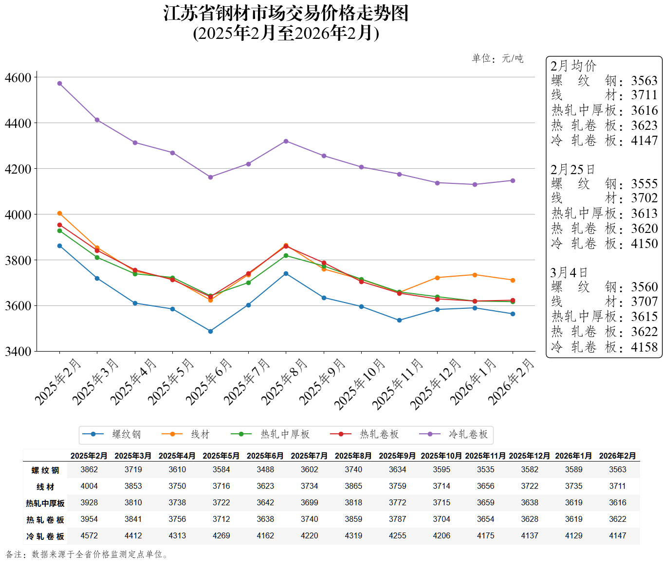 江苏省钢材市场交易价格走势图(2026年3月4日)